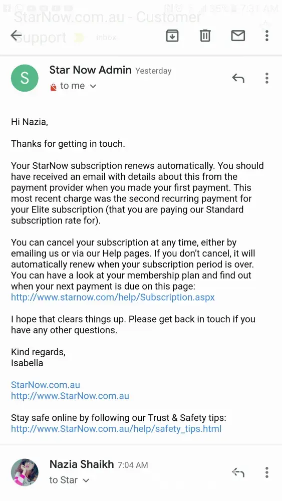 I have been a loyal paying member of StarNow for many years, in fact since it’s inception as a business. I pay via direct debit and have done so for years, so 6 monthly payments are taken out of my account.