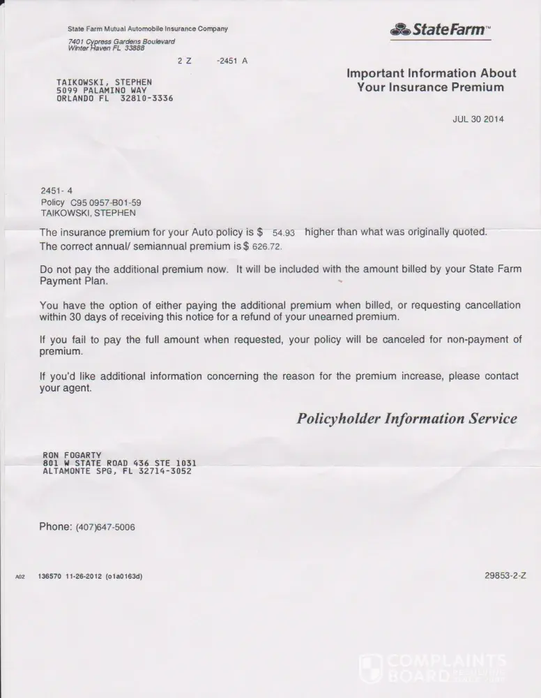 I switched to State Farm because they promised me a policy for $ 98.47 per month. I confirmed this with Dimario, confirmation # 4M3DG9PL. I asked him twice if he was sure that was the correct price, both times he said "Yes I can see all your information right here". I went ahead and paid for the first month, and told him to send the paperwork for me to sign. Well, 2 days later I got a letter from State Farm saying...""The insurance premium for your Auto policy is $ 54.93 higher than what was originally quoted..." Needless to say, I was furious, I called up and told them that this was unacceptable, and they told me that if I didn't sign the paperwork, they would report me and cover me in a "different way" at a much higher price. I am now trying to scan the letters they sent me, and will hopefully get somewhere with these people.