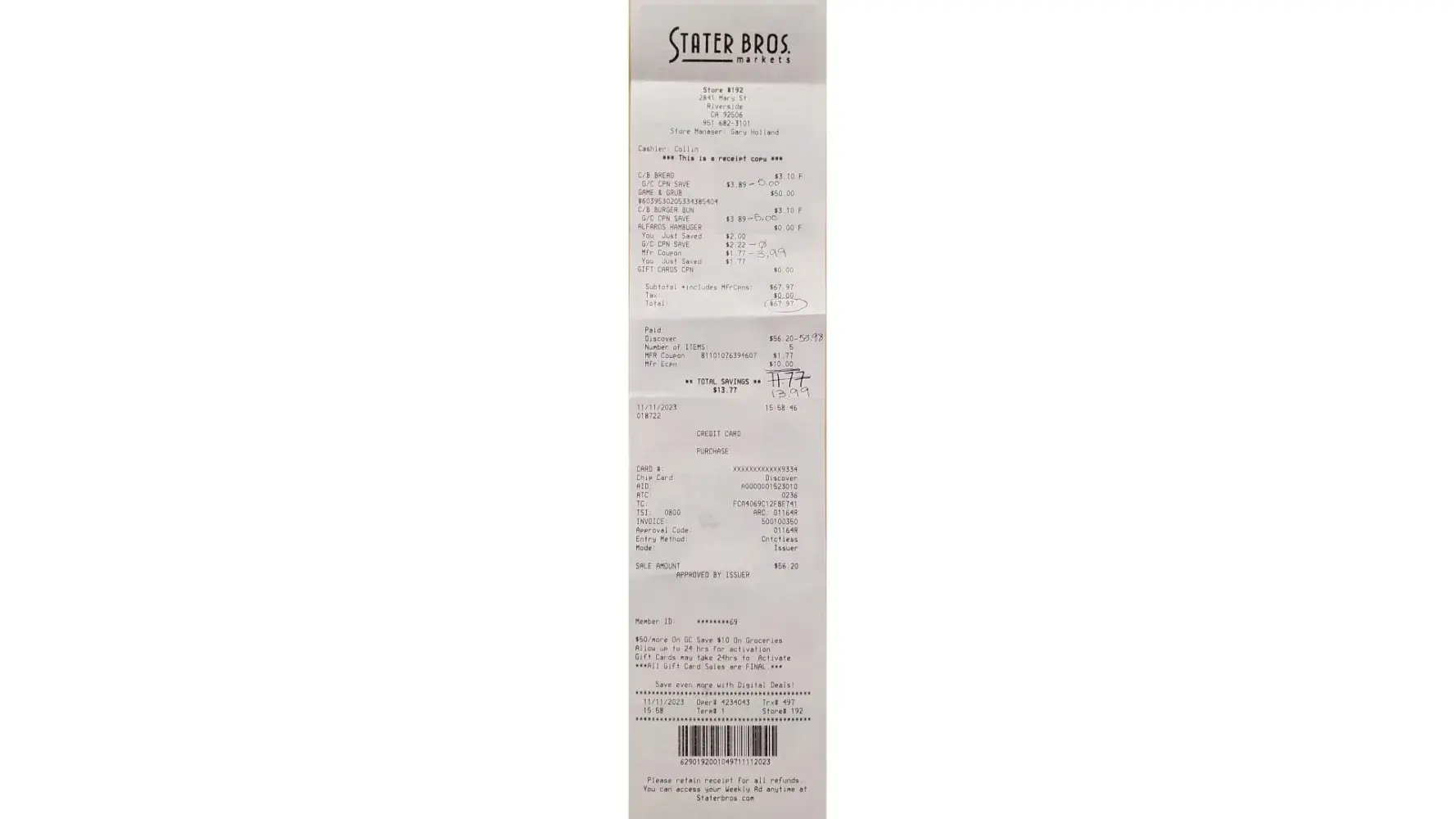Items purchased: 2 loafs of bread (6.99 ea), 1 pk of hamburger buns ($3.99), 1 $50 participatings gift card. Coupons used: $6 manufacturer coupon for the hamburger buns (value was more than price so they should have been free). $10 off groceries when you buy a specific, participating gift card. The problem was that their computer took the $10 off first...