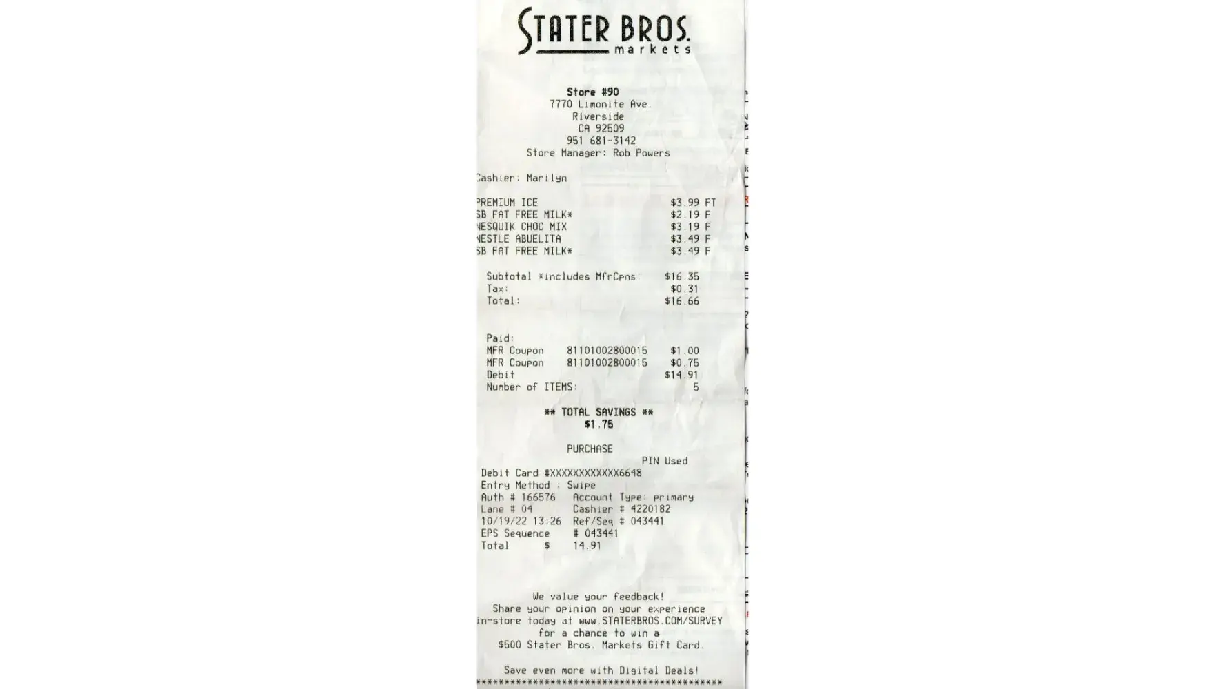Stater Bros Markets Cashier/ donna store # 101