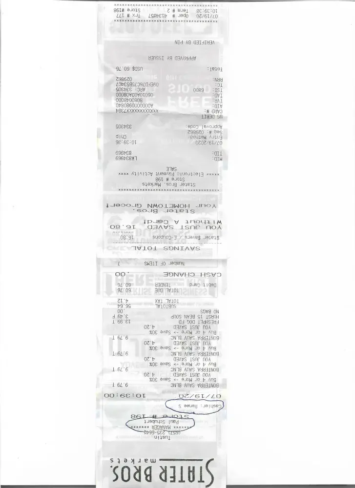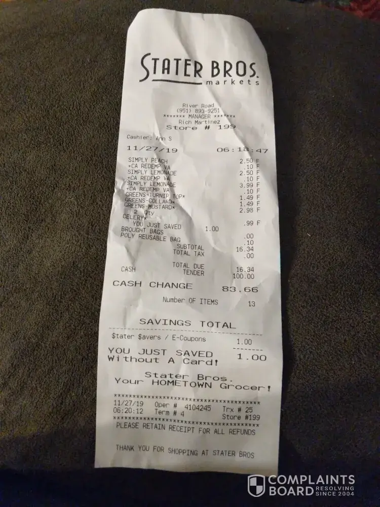 I will be awaiting your response to this incident. I have attached a copy of my Stater Bros. receipt from yesterday and have listed Web site information for current COVID guidelines/discrimination.