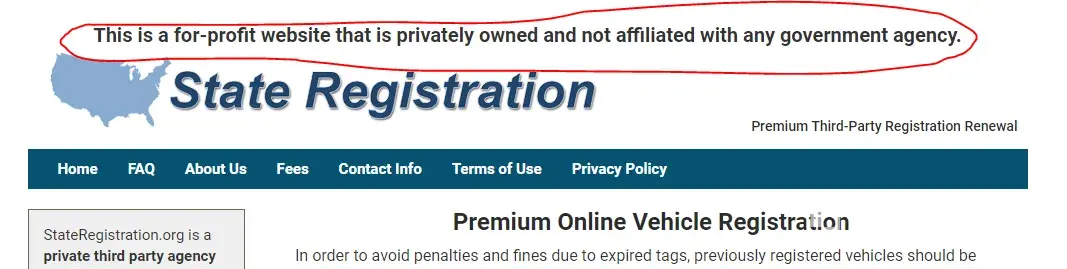 website mimics state site for registration renewals and charges unnecessary fees