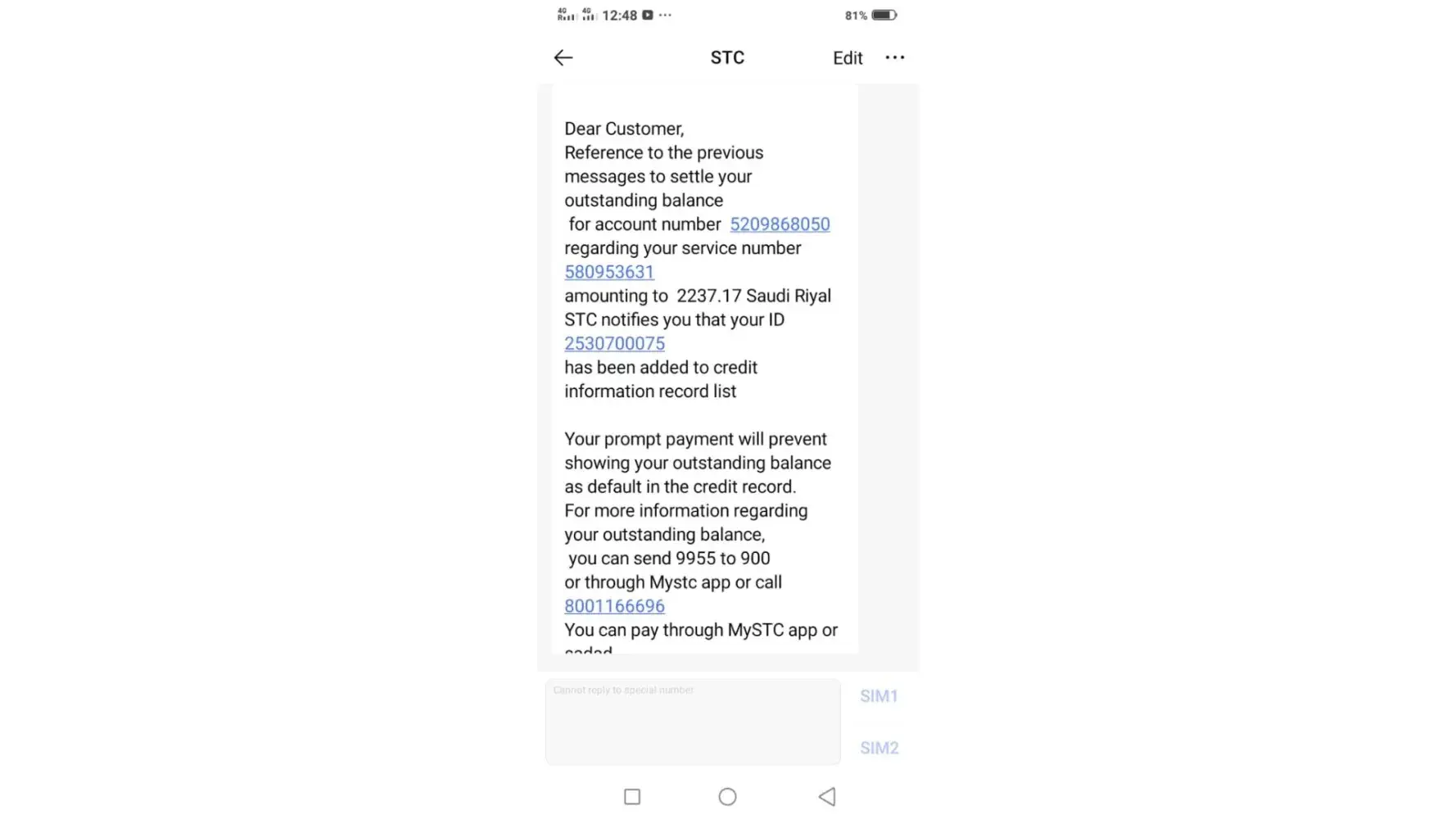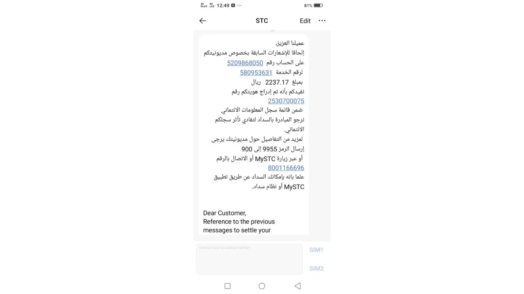 dear sir .. please deactivate all my sms servicess from my sim [protected] so i can recharge comfy because my stc sim in my mobile is disconnected
