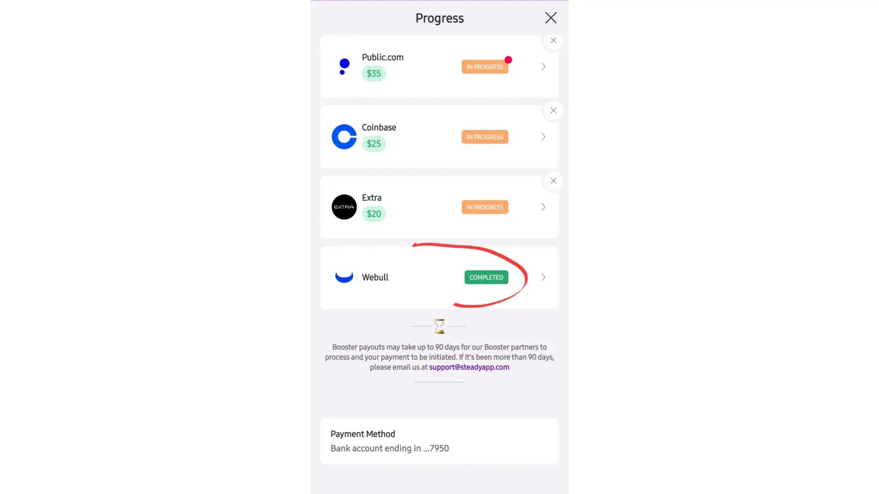 I completed the Steady income booster for signing up to complete my first Doordash delivery. I completed my delivery the same day. I reached out to Steady for my booster payment. They refuse to pay because they do not have a screenshot of the "Welcome congratulations" email from Doordash. If you read the terms and conditions, it does not state that Steady must have an email screenshot. I've completed all the necessary steps from my end but Steady refuses to pay. I would like the money that was promised to me for completion. I've attached proofs and Doordash stating when the account was made and if it's active. This company just wants you to link your bank account so they can steal your information.