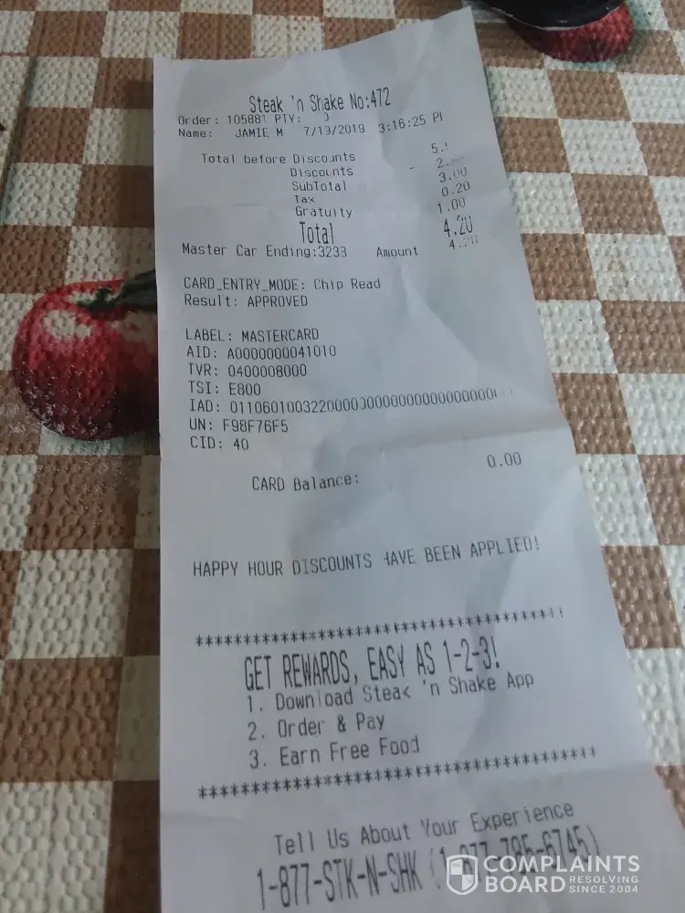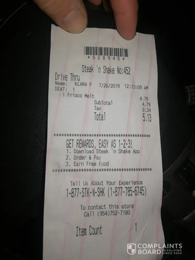 On July 19 my sister and I visited your store in Ashtabula, Ohio for lunch. The store was moderately busy with 3 wait staff on duty. We were seated right away and a waitress greeted us and took our orders. Our milkshakes were delivered promptly. However, then everything went downhill from there. We saw many tables seated and served after we had given our orders. There were tables that our waitress had after us that were served. We were very patient but after about 30 minutes my sister asked a waitress where our food was. She informed her that there was a ticket before us and we would be next. Keep in mind that tables seated before us were already served. During this time we also saw another table get up and leave because they did not get their food either. Finally we decided enough was enough, got up, paid for our milk shakes and left. It wasn't like we had done a special order or anything for it to be so long. She wanted a grilled cheese and I wanted a double steakburger. I love Steak n Shake and have never had an issue like this before but I will certainly not go back to this store. The one in Mentor, Ohio is usually my go to store. I am attaching the picture of the receipt of our check out time. We go to thus store at 230.