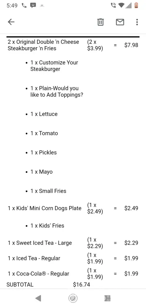Order #[protected] I placed an online order of 2 double cheeseburgers, a kids mini corn dog meal, 1 large sweet tea, 1 regular unsweet tea and 1 regular coke. My husband picked up the food only to be told they lost our ONLINE order. I spent $4.28 for the 2 teas only to not get them. I will not go back to the steak n shake ever again. I would also like my refund back for the 2 teas I did not get.