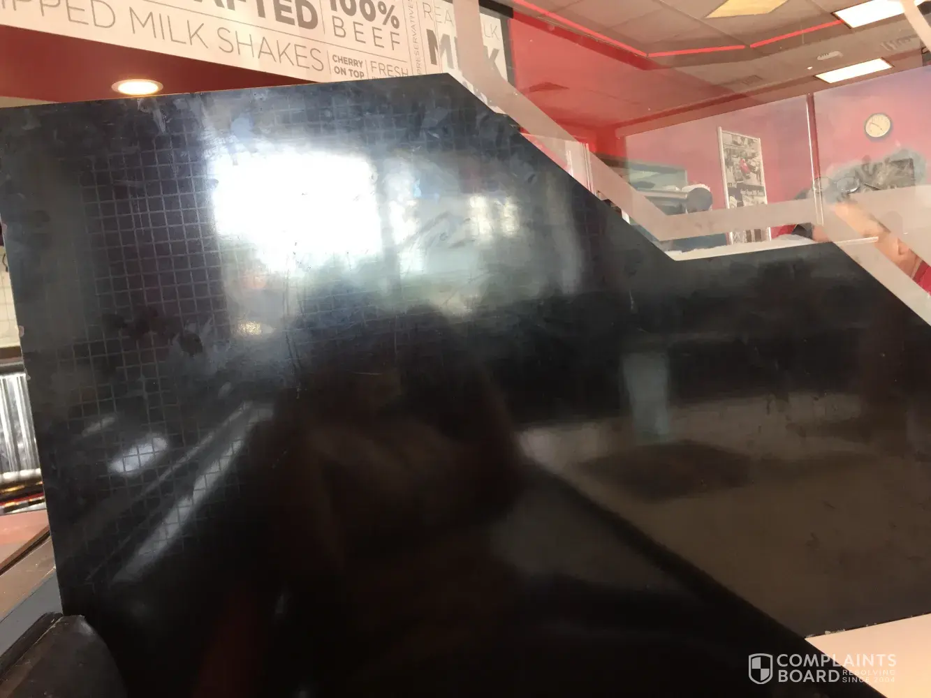We love Steak and Shake food! However the one closest to our house is always filthy. The floor looks like it hasn't been mopped in years. The black wall that divides the booths is also in desperate need of cleaning. There are grease and hand prints all over it. The tables are also wet from being wiped down when they seat you. There is always lots of food on the floor---see photos. We usually get fast service, but we have to try to ignore our surroundings.