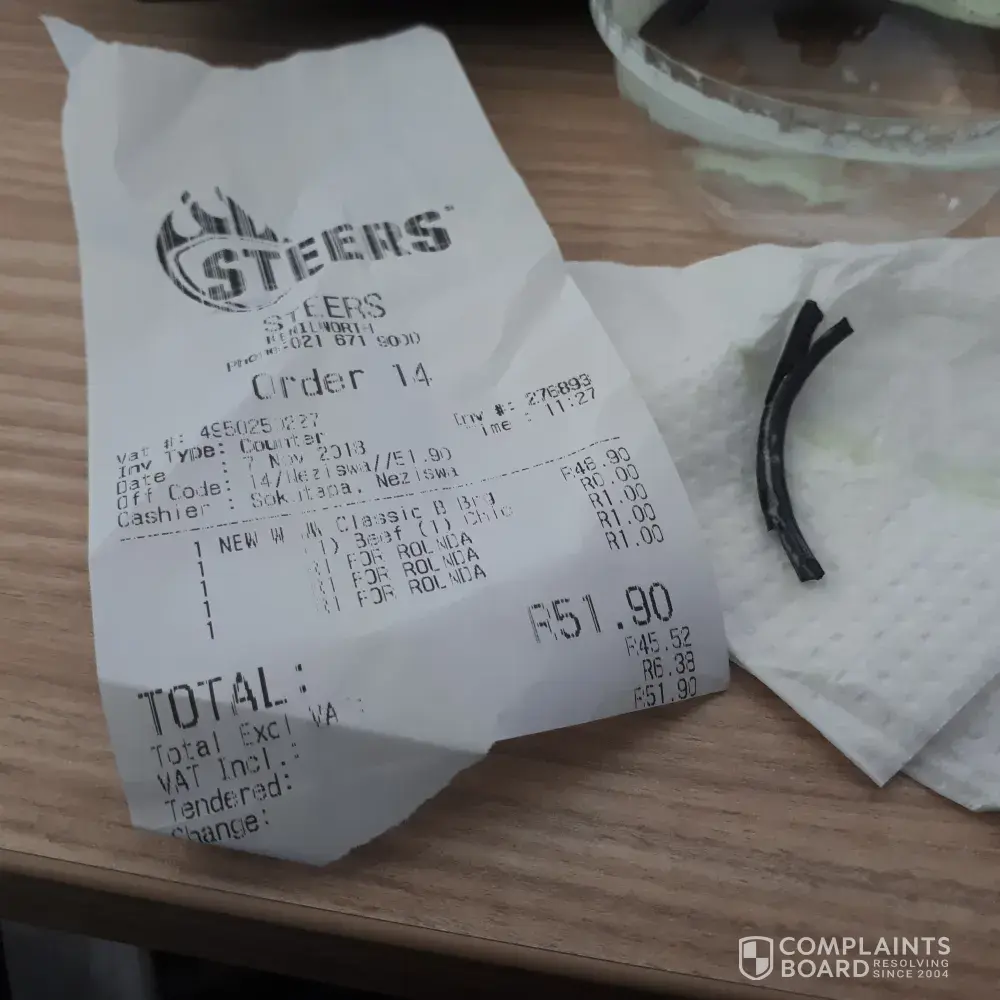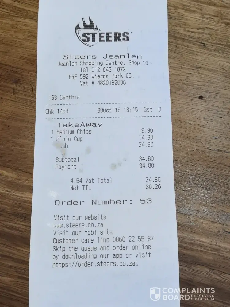 I sent a complaint on the day to info.[protected]@steers.co.za and no feedback