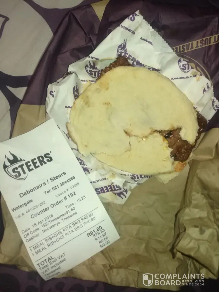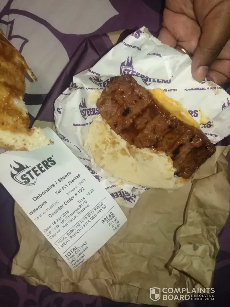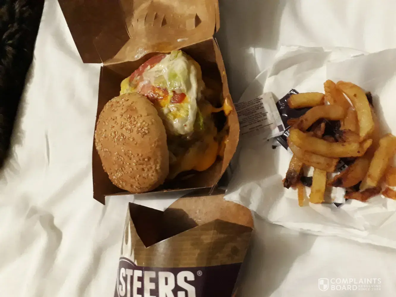Iv been a fan of steers burgers for some time. The patty is very juicy, but for some reason yesterday I didn't enjoy meal (Borewors burger) That burger looked like it was thrown on to the roll.. all the was on the roll was cheese, patty and sauce. No pickles, lettuce, tomato. Who are you people feeding Dogs. Sadly I was home when I saw it... m sure I could have brought it back