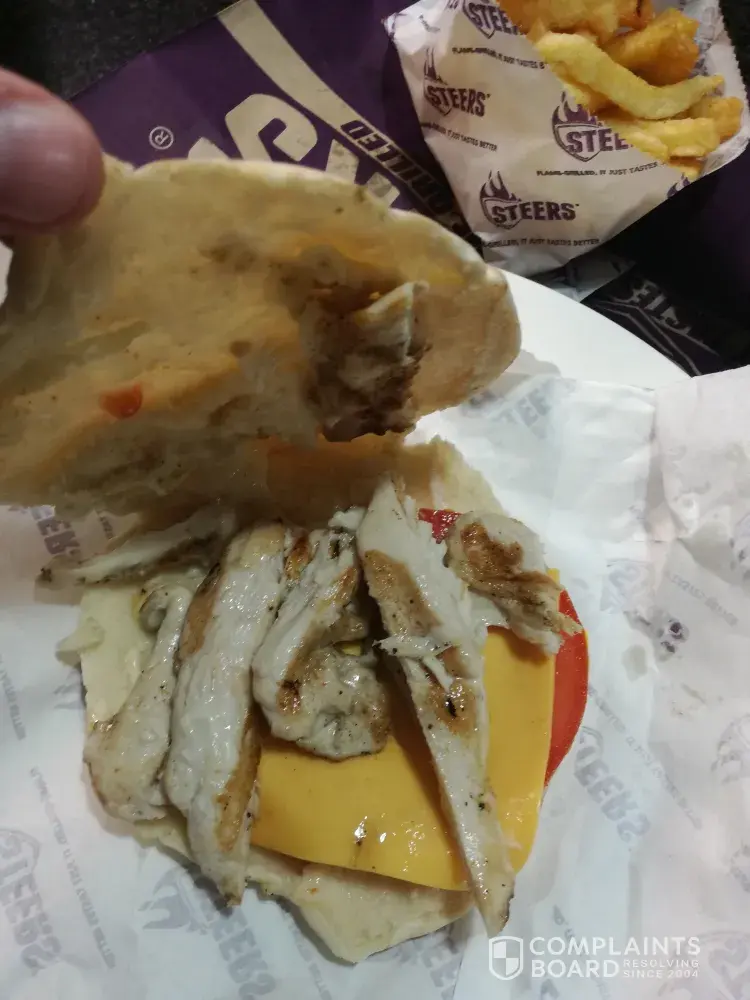 My name is Zanele Precious, from South Africa in Mpumalanga, with mobile number +[protected]. I bought 2 Mighty King Steer burgers at Steers Engen Ermelo. My fiance and I were looking forward to having our burgers, but to our surprise, the chips were burnt and hard as if they were not thoroughly prepared. The lettuce and tomato looked as if they were chewed 1st and spit inside the bun. I am very disappointed in the product I bought. I am a huge fan of Steers burgers but this time around, I wasn't satisfied at all.