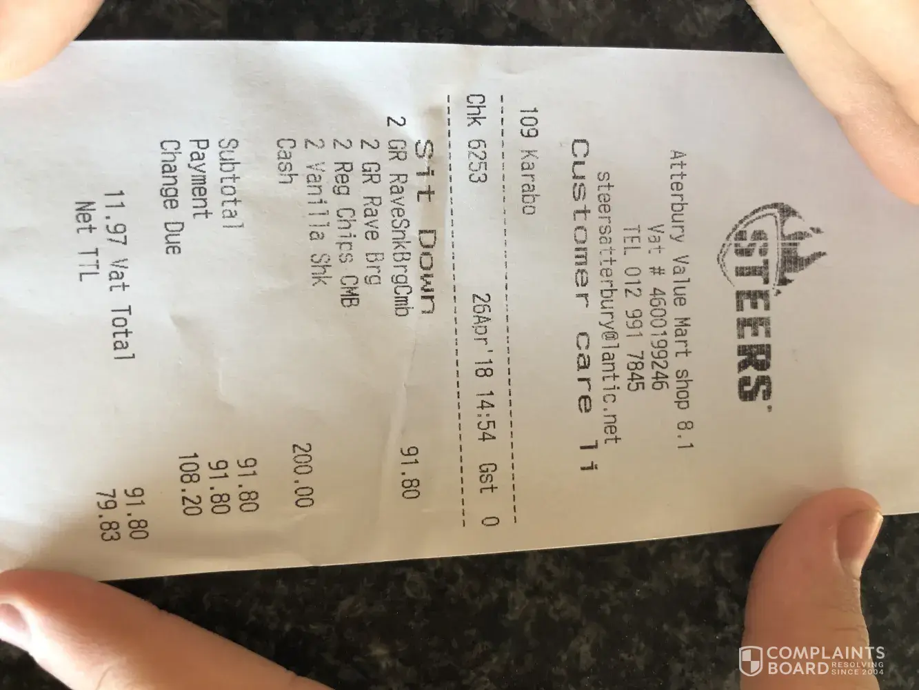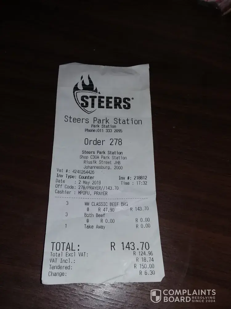 On 20/05/2018 I had gone to purchase lunch at Steers Sunward Park (Boksburg) Having 3 hungry minor children with me due to no electricity at home I decided steers would be a great option.