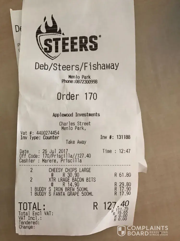 I am very sorry but this service I have received from the Steers Brackenfell staff is totally unprofessional and I seriously think that this matter needs to be addressed.