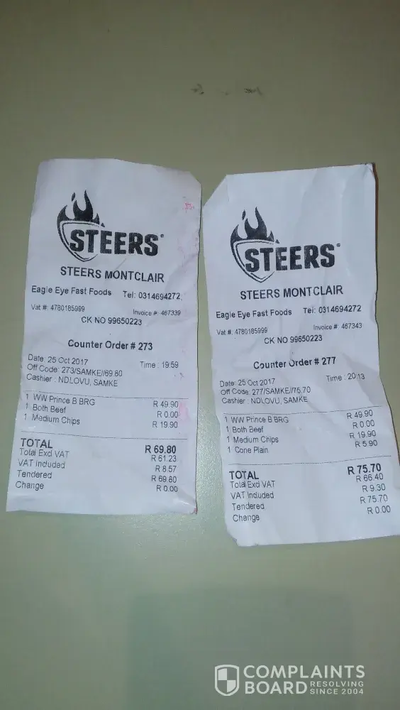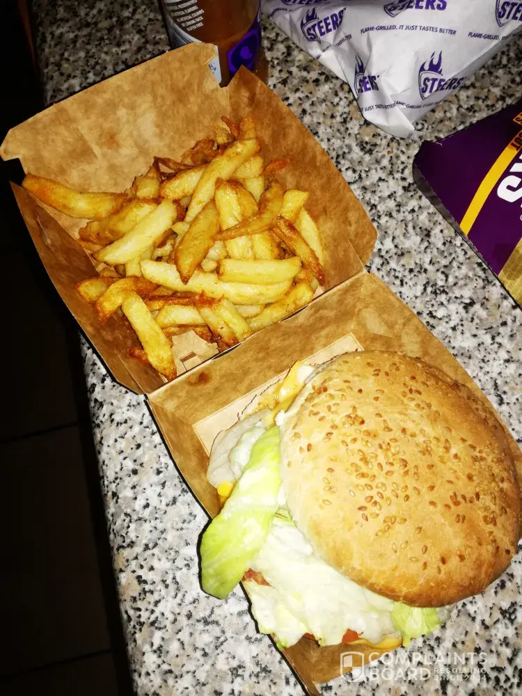 I ordered the original king steers burger from steers Menlo Park Menlyn and what I received was disappointing. The chips where burnt and were like pap, the patty was half done and the burger was not neatly done. I suffered serious cramps and from this experience, I don't think I'll ever buy from steers again. What I experienced was horrible and I cannot afford a loss like that again.