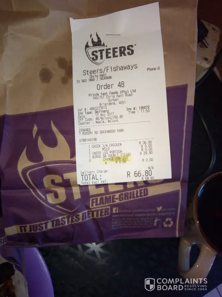 We buy a lot of take away at our local Steers. A few weeks ago we ordered food for delivery. When the delivery person left we noticed that the one order was wrong, we phoned the shop and they just said "Sorry"