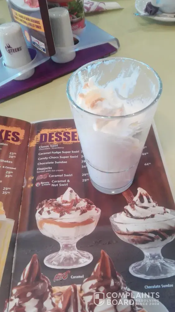 We stopped at the Steers at the ultra city in Queenstown. I just want to bring this under your attention as this is false advertisement. One of our party ordered a caramel fudge super swirl(she had to reorder as they realized after 15min after the order was placed that they didn't have a waffle machine) and this is what she got instead (see below picture). As we are still paying full price I aspect to get what I see on the menu. Really disappointing.