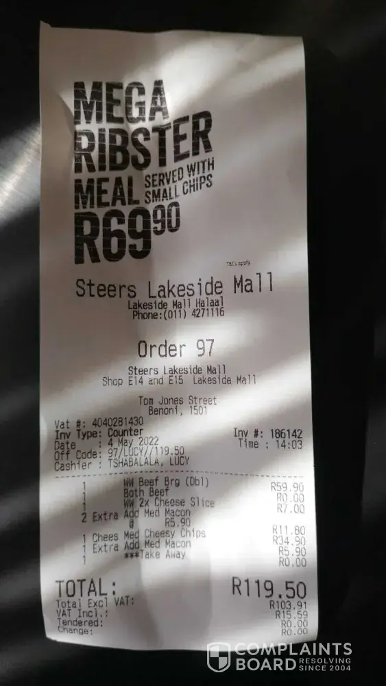 I already put in a complaint on the 9 july and nothing. I bought some food at our new steers meiringpark klerksdorp on the 8 of july order 74 for R459. 60 for 3 of my family and we were so unhappy about the Patty's it was full of hard pieces in it we could not eat it i did put in a complaint on you email customer care on the 9 july 2022. There will as a lady caling me but she said that she was from potchefstroom and wil let the people call me and nothing this is not acceptable really it was a lot of money. Please let me know what is going on i want answers.