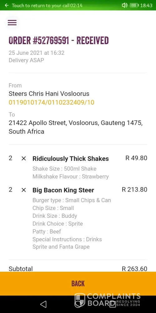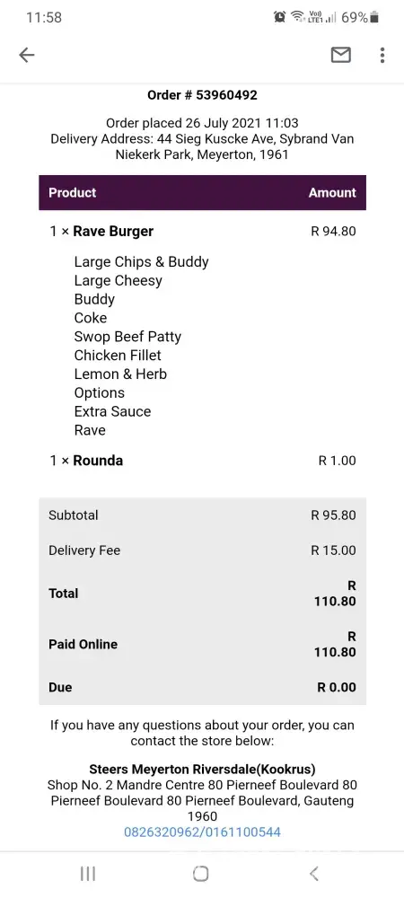 I made an order at Steers Meyerton for delivery this morning (2021/08/07)