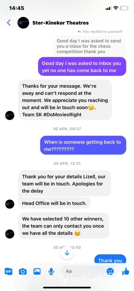 Desired outcome: Id like Ster Kinekor to just confirm what I won and deliver my prize and also to apologise for their poor serivce.