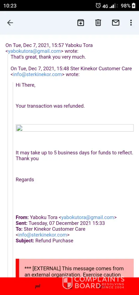 I refunded my tickets for Spider-Man no way home a total of R184 on Friday 3 December 2021and I emailed Ster kinekor the next day they said I should wait 5 days and I did but still nothing reflected on my account and I went to the bank they said there was no transactions done I tried emailing them again today on Monday 13 December 2021but they said it's my bank