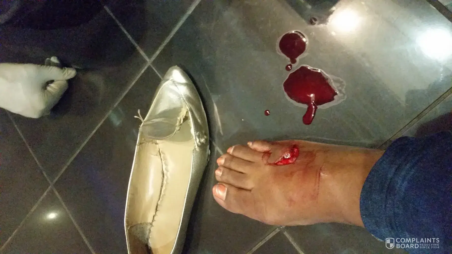 I went to watch The Foreigner starting at 20h30 on the 28th of December 2017, Cinema 4. When I got in it 20h25 it was pitch black at the theatre and screen off. I manoeuvred my way to my sit in that darkness and sat to watch the movie. When it got finished, I stood up up to leave only to be scraped my flesh off on my right foot by some aluminium metal that was on the step. The blood was everywhere and my shoe was ripped apart. I had to go to be taken by ambulance to the hospital 1 hour later and got stitched. I can not walk and had to buy crutches in order to walk.
