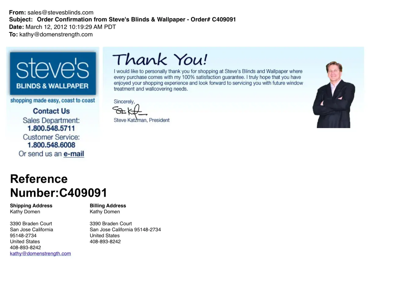 Hi, Ordered wallpaper from this company and paid for using pay pal, as i live in Scotland i was told i had to pay extra shipping costs as i was outside USA, which i paid then heard nothing from that point .Have repeatedly e-mailed them asking for confirmation that all is in order and information when the order will be shipped .I did a search on this company and see that they have a number of complaints raised for similar service my order is in the region of $200 dollars .I hope that they come good with the company logo which states 100% customer satisfaction but i pretty much doubt that the only person who has any satisfaction is MR STEVE KATZMAN who is the owner of this company who for little or nothing has duped me out of my money and and probably countless others ..So be careful before you jump in as the word con man scammer seems appropriate, or have i got it wrong and sales@stevesblinds.com are just overworked and taking time to ship my order ..so speak up Steve what is it. G.Anderson.