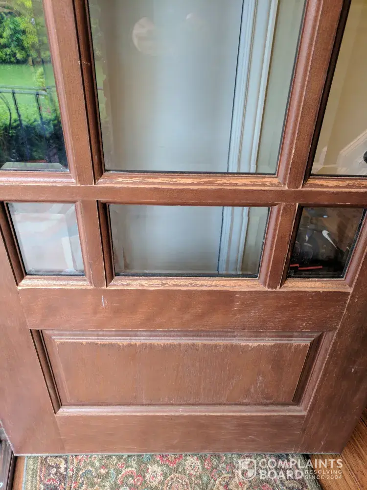 I purchased front door couple of years ago and the door has begun to weather one year after having it. It's now 3 years old and has weathered terribly. The door has splitting wood lost its color and condensation built up between the glass. I spent $1, 000 on the door from Home Depot and could not be more disappointed. Also the door is located under a porch with a 9ft overhang. It has never been touched by any sort of precipitation.