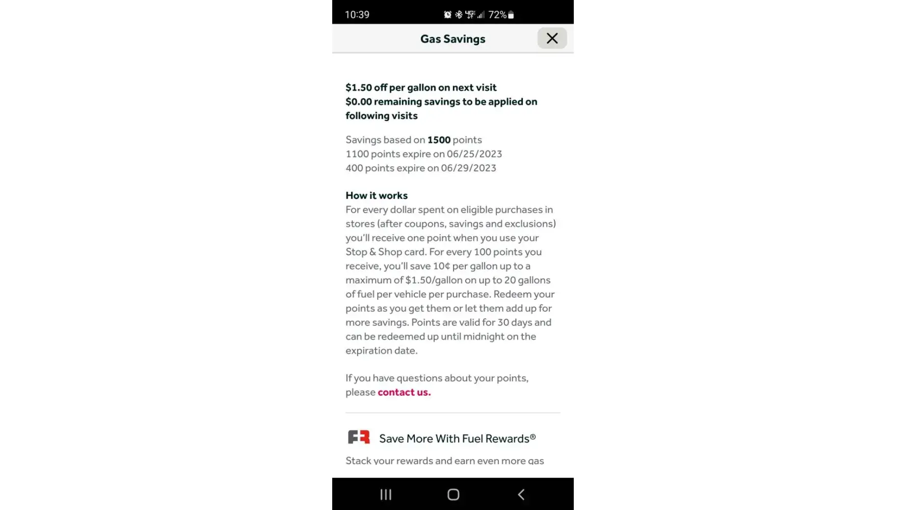 Desired outcome: Tell me how quickly I need to use my fuel savings to get the full cents off as shown on my Stop & Shop receipt.