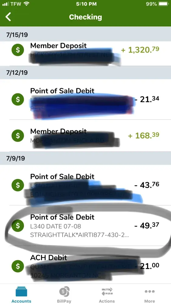 I have had straight talk for about 7 years and no problems. On July 8 (on my bank statement ) it shows 49.37 taken out of my account well on July 26 my phone service isn't working and I had no choice but to buy another 45.00 phone plan. I called straight talk and they can see all past purchases of my phone plan but they can't find 7/8 purchase- how strange is that! So I have paid 100 for the month of July and they said oh well there's nothing we can do?! It's absolutely ridiculous that I have paid and have proof on my statement but because it's disappeared on their end I'm the one screwed! Below is the purchase I pd for in July 8th and another purchase I had to pay for on July 26th to use my phone