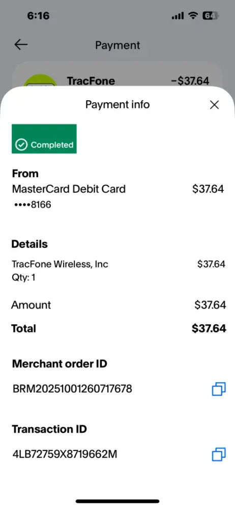 Paid twice October 2, 2025,for two months trac phone plan/service. My bank account was charged twice and instead of the two months activation I have been cheated one month. My two separately purchased plans should expire December 2 or 3. So either refund me the $37.64 or credit my account for another month as I paid for two not one.