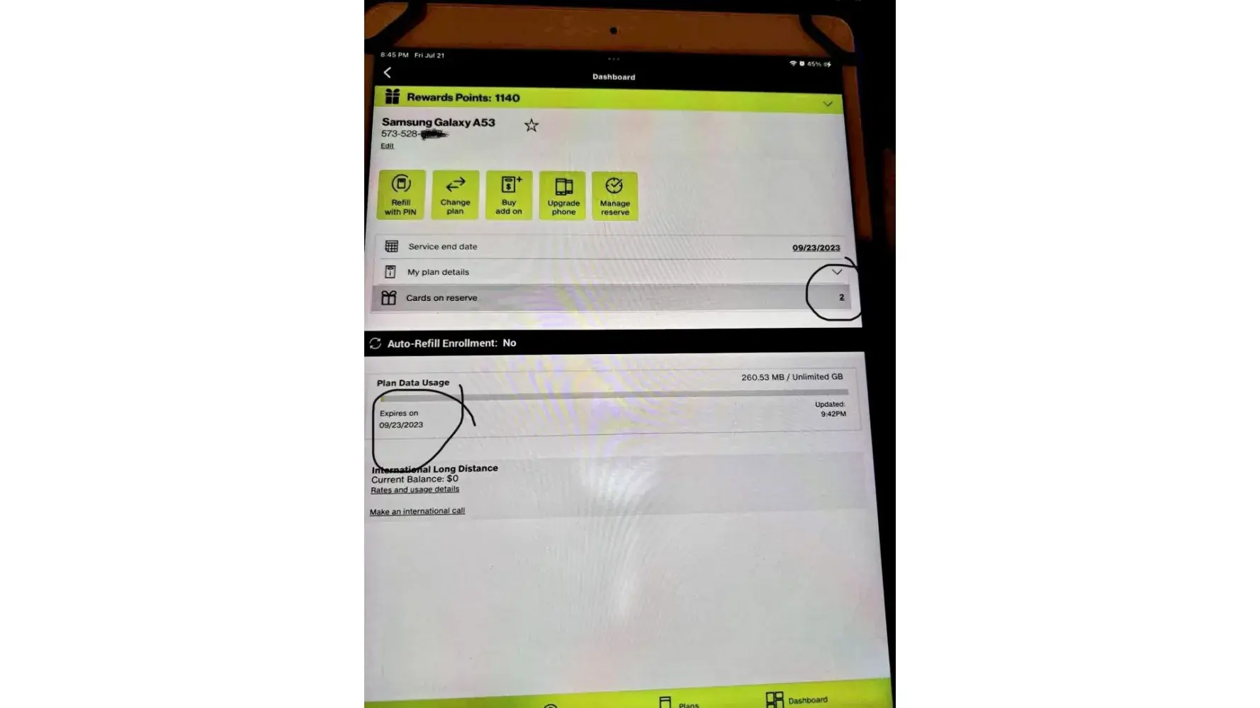 Talked with Maria, Customer Service Representative, all she did was look at my account and tell my service end date was 8/24/2023. Maria didn’t know what happened to the month of service I had in reserved to extend my service to 9/23/2023. Absolutely, no help. The above picture shows end date of 9/23/2023.