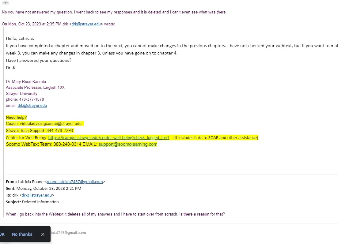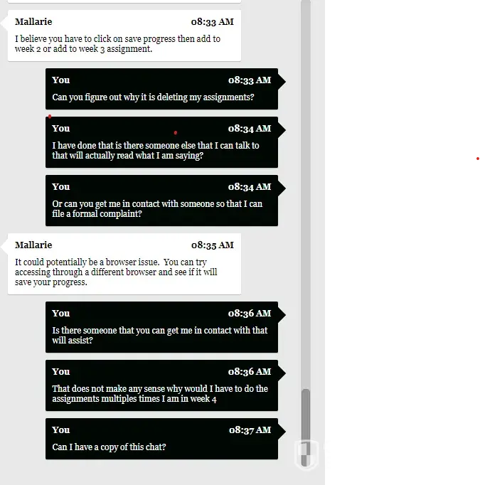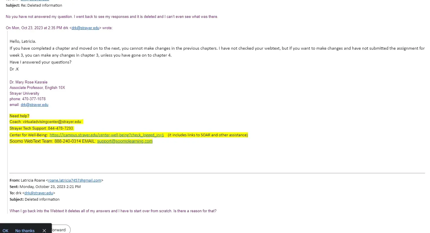 I am an honors student and I have completed my assignments however they have been deleted. I have grades for them, but it is an English assignment which I have no access to any longer. I have reached out to my professor, soomo, wrote multiple tickets, and spoke to their chat option. I am taking four classes and there is no time to have my assignments erased. I have one person telling me to go to someone else to figure out the answers and I have another person saying that it deleted because of my web browser. My assignments are getting turned in and graded how am I no longer able to see my assignments afterwards? This is crazy that I have to go through so many options when the system that Strayer is using is making a mistake.
