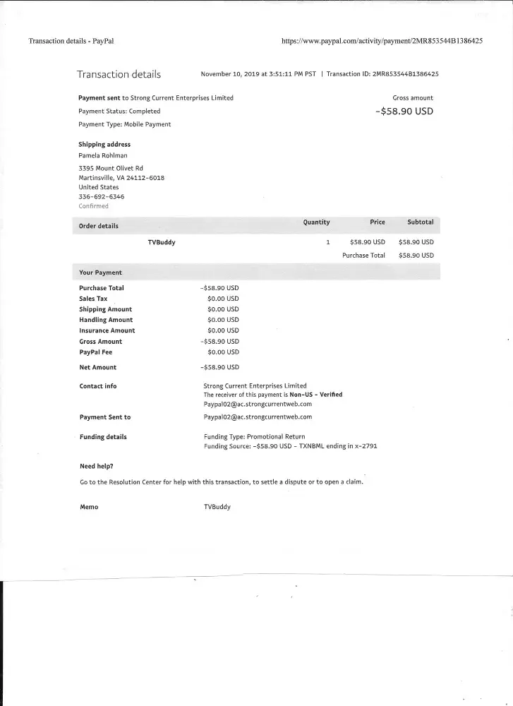 I ordered this product November 10, 2019 and paid $58.90 through [protected]@ac.strongcurrentweb.com, Transaction ID: 2MR853544B1386425. I printed off the transaction record through my paypal account. I have never received the product and do not see how to contact them directly. The Funding Details are "Funding Type: Promotional Return, Funding Source: -$58.90 US - TXNBML ending in x-2791" whatever that means.