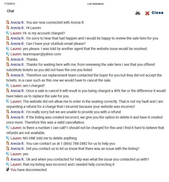 I sold tickets via StubHub, the event organiser then changed the seating allocation to better seats, further forward. I tried to offer the new ticket to the buyers via StubHub (at no charge). StubHub promised to get back to me within 48 hours on 4 occasions. They didn't. Eventually the buyer rejected the new seat allocation and StubHub refunded them and charged me $84 dollars. During 2 live chats the agents accused me of ruining someone's birthday or wedding or special event and said I had not delivered what had been bought!