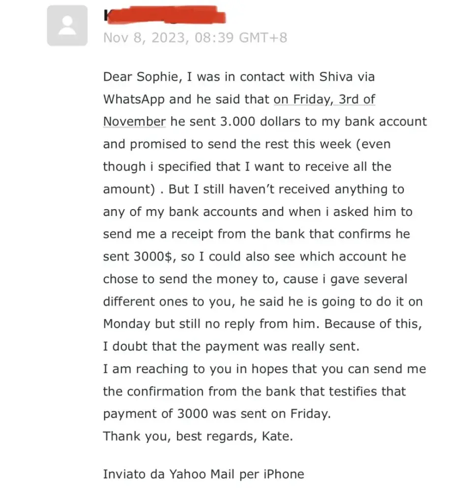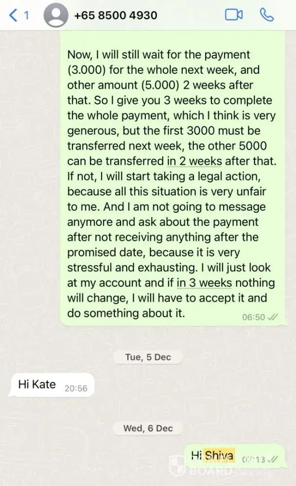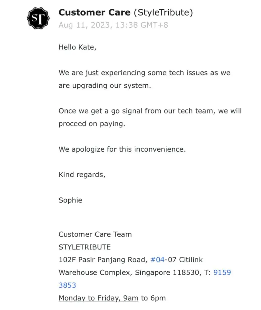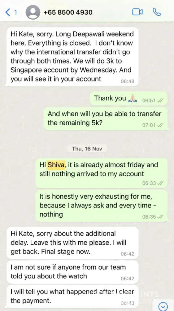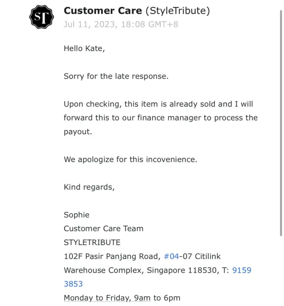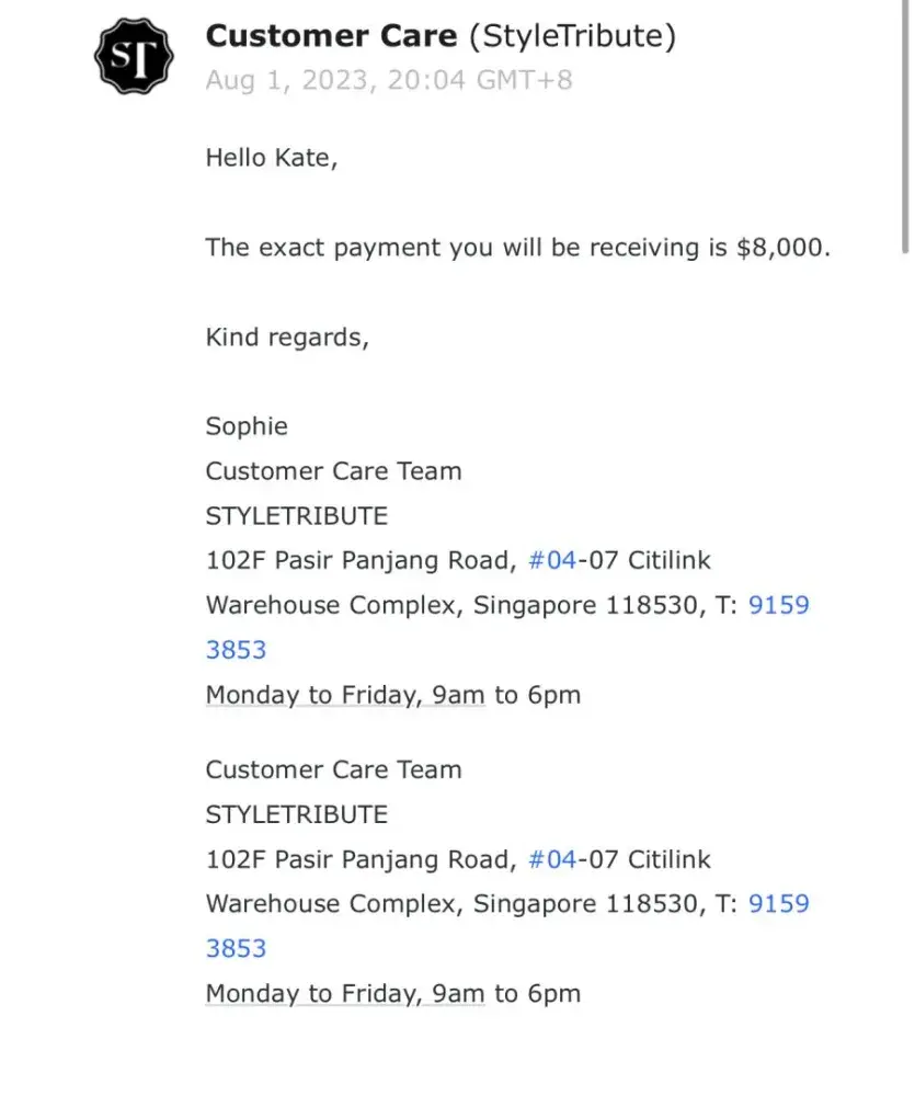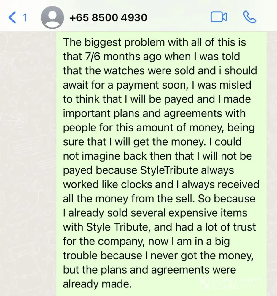 I have all the confirmation of my words in screenshots that I attached to this complaint. I also can provide the contact that I have with Style Tribute. My watches were sold 8 months ago and i haven’t seen any payment. They amount of money is 8000 SGD. They basically stole all the money from the sell of the watches. Sophie in the customer service and Shiva ( the owner) just keep promising to pay in 2 weeks each time I complain about the lack of payment, and it never happens. Once they even tried to make it seem that they sent me the money via bank transfer but it didn’t go through because it is an European bank account. Then I created a Singaporean bank account and they could not invent any excuses anymore so they just stopped answering at all. I am going to start a legal action against them soon. Now the only thing that Shiva writes to me is: Hi Kate. And then silence.