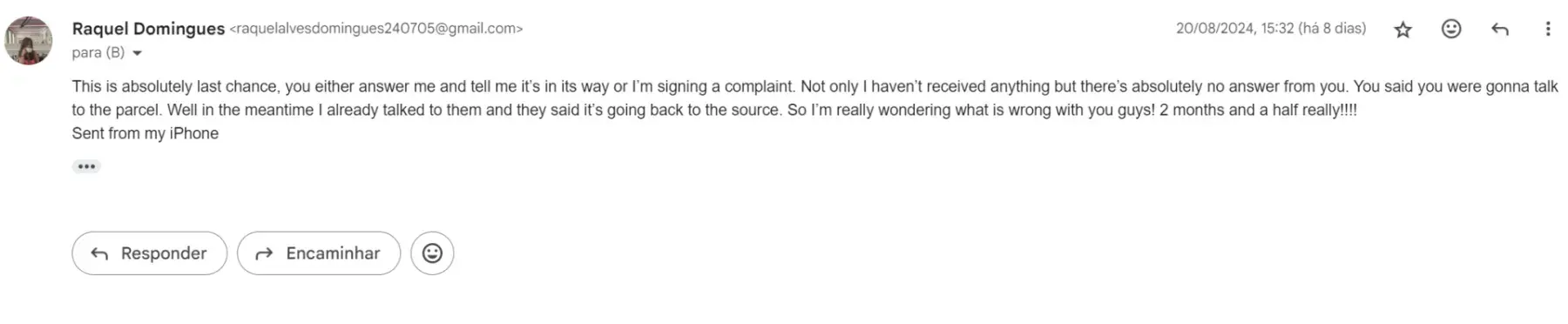 Desired outcome: Either ship my order, reply to my email or give me my money back