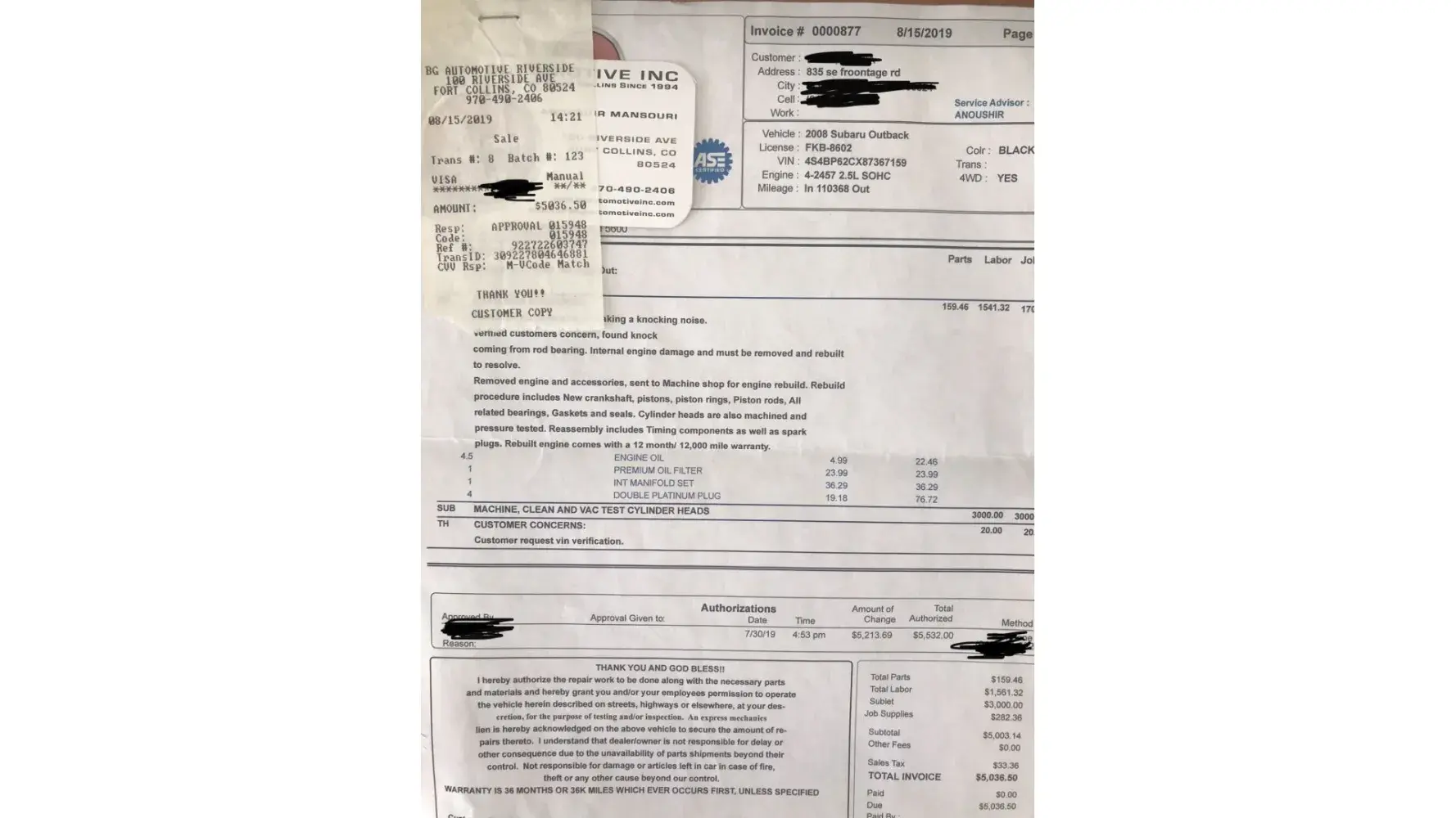This was the result of a lack of warning or indicator that the oil in the car was low. This is fault and failure of the Subaru Outback (2008), as a warning light should have warned of low oil, especially since a lack of oil is detrimental to the car. In truth, no car should burn through oil as mine did in the first place, especially not that rapidly. I am requesting a refund for this repair. I have attached the invoice from this service.