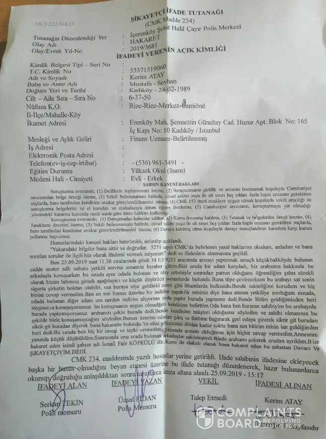 After we finish the conversation with the responsible Ümit bey. I have asked for an discount if i have a chance to take. Than the person İsmail Faiz Köprülü which constantly intrupted us again made some comments such as "Go to other service if you can take any other discount". I have been shocked after this rude interruption. Kindly reminded him why he is mobbing and inturpting me and my mother since he is not the responsible which is involved with me and asked him his unrespectfull speech. Than he said that he is the owner of this Cadde Motor and ordered the staff not to repair our car. Than started to shout and swear to me in the front of my mother and the workers. I have never replied to his bad words or assault attempt but my honour and family relations have been hurted deeply.