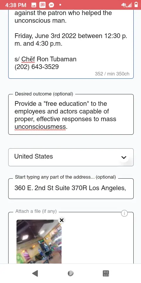 ... refused to help an unconscious patron and screamed at the other patrons who helped him out. Then conspired with homeless, tattooed, private security and state actor firefighters and paramedics to retaliate against the patron who helped the unconscious man. Friday, June 3rd 2022 between 12:30 p.m. and 4:30 p.m. s/ Chēf Ron Tubaman [protected]