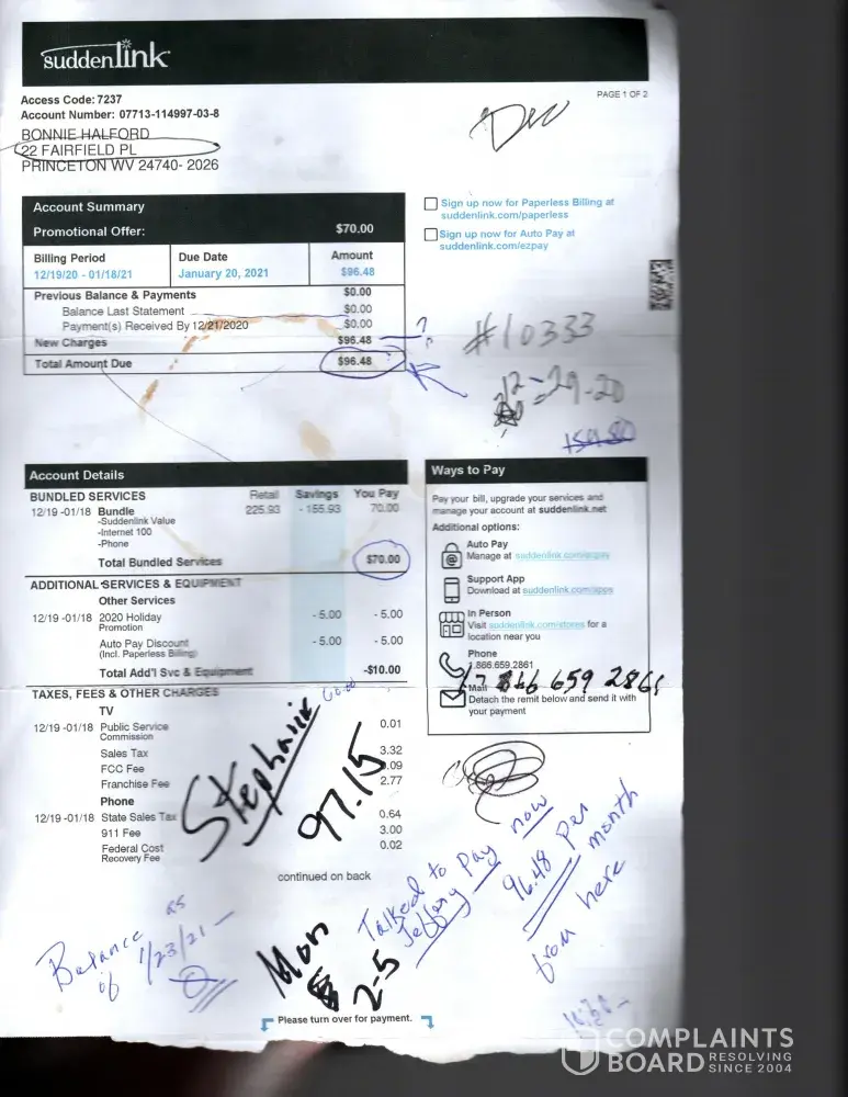 I called suddenlink 3/30/2021 at 7:45am ph# 1/[protected] s/w Jackie. I explained I was moving, also unhappy with latency issues and wanted to cancel my services by 4/1/2021. She said she will cancel my services and asked for a forwarding address. I gave her my PO Box for a forwarding address for the final bill. I asked if I could still pay online as I...