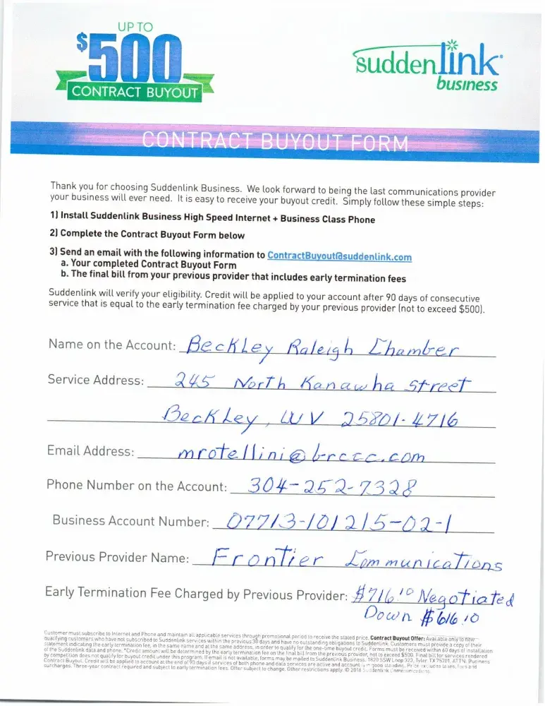 Raleigh County Chamber Of Commerce 245 North Kanawha Street Beckley, WV 25801 Phone [protected] Account#[protected] RE: Contract Buyout We have attempted to contact Suddenlink numerous times and get hung up on or never receive call backs. This matter has been the most frustrating! We agreed to a contract buyout back in January of 2020. The buyout...