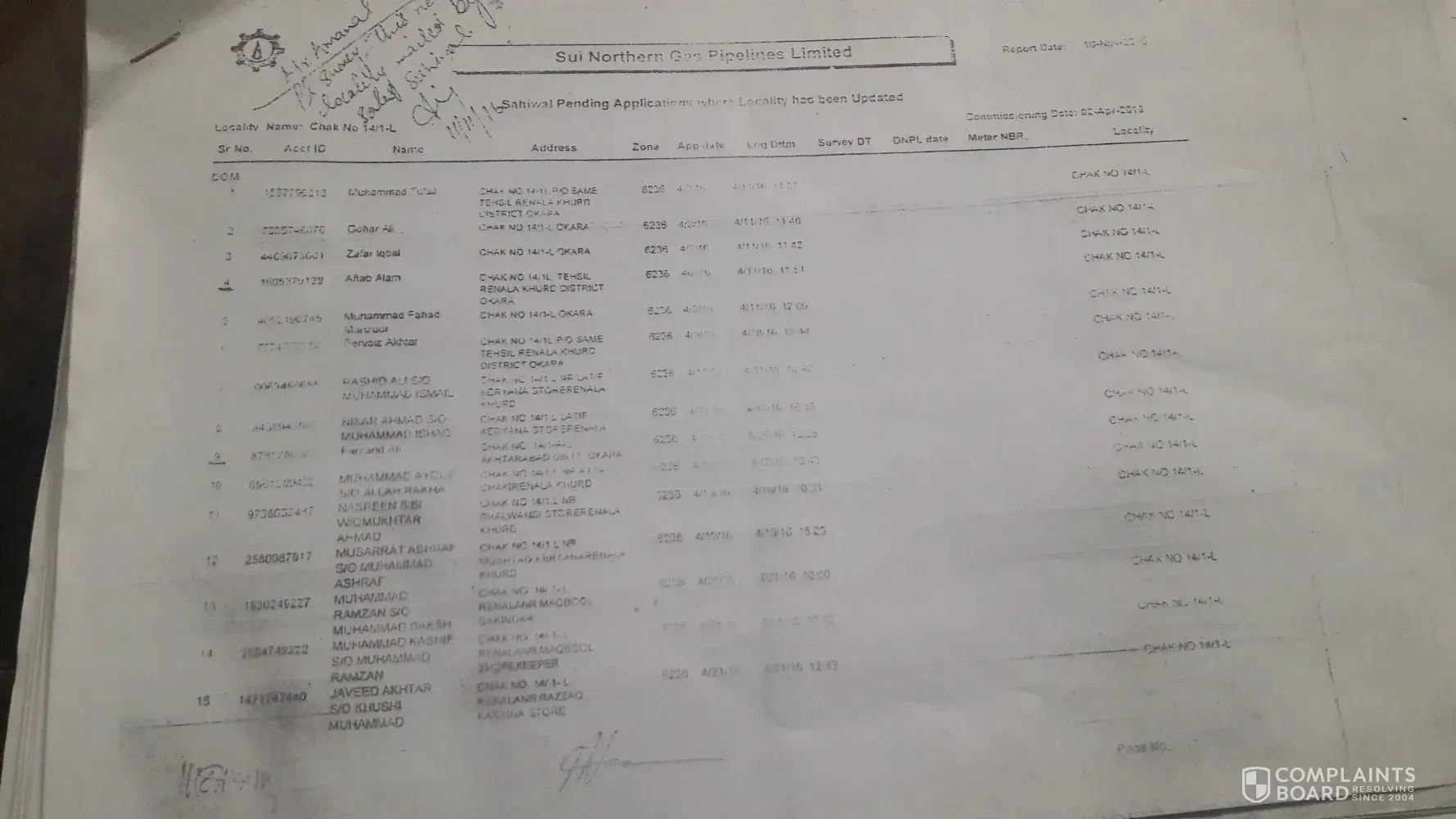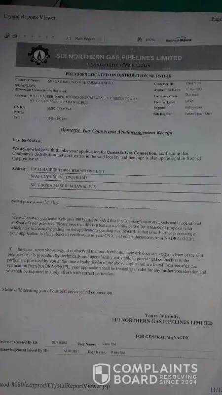 Sui Northern Gas Pipelines [SNGPL] complaint of new domestic connection application no.[protected]