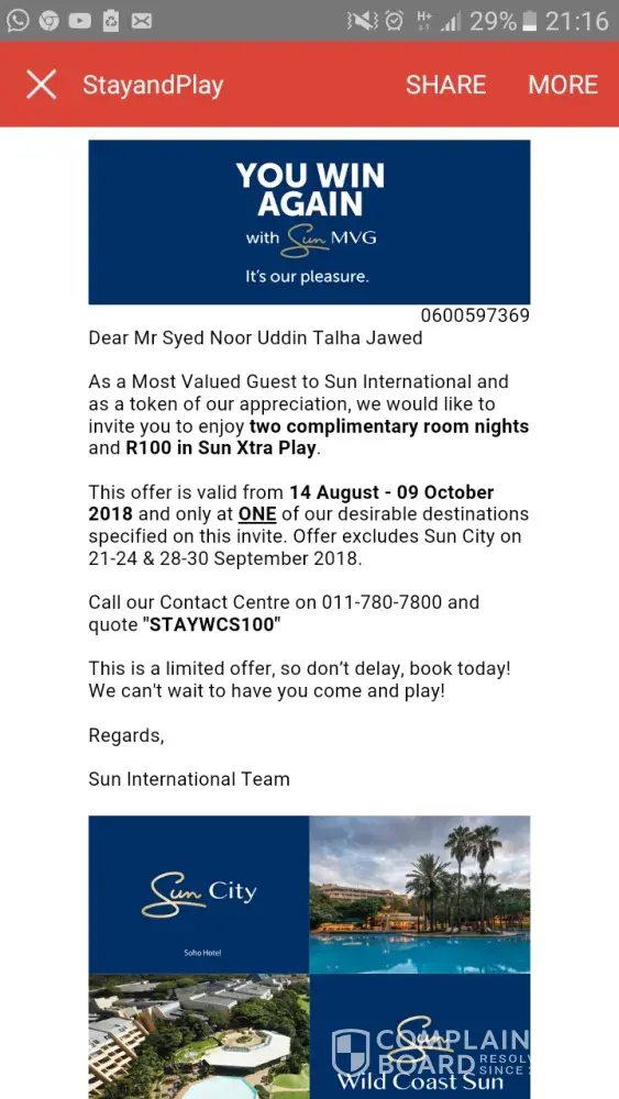 Hello my name is syed nooruddin talha jawed. I m enjoying gambling in your one casino sun sibaya. The staff and managment is very good. But only one problem i have every time u gave me free accomodation in wild coast sun and soho hotel but i never ever move to both casinos because of my bussiness. I spent almost every night in sibaya but i never get any time free room in sibaya so my request is next time dont give me free accomodation in wild coast sun.
