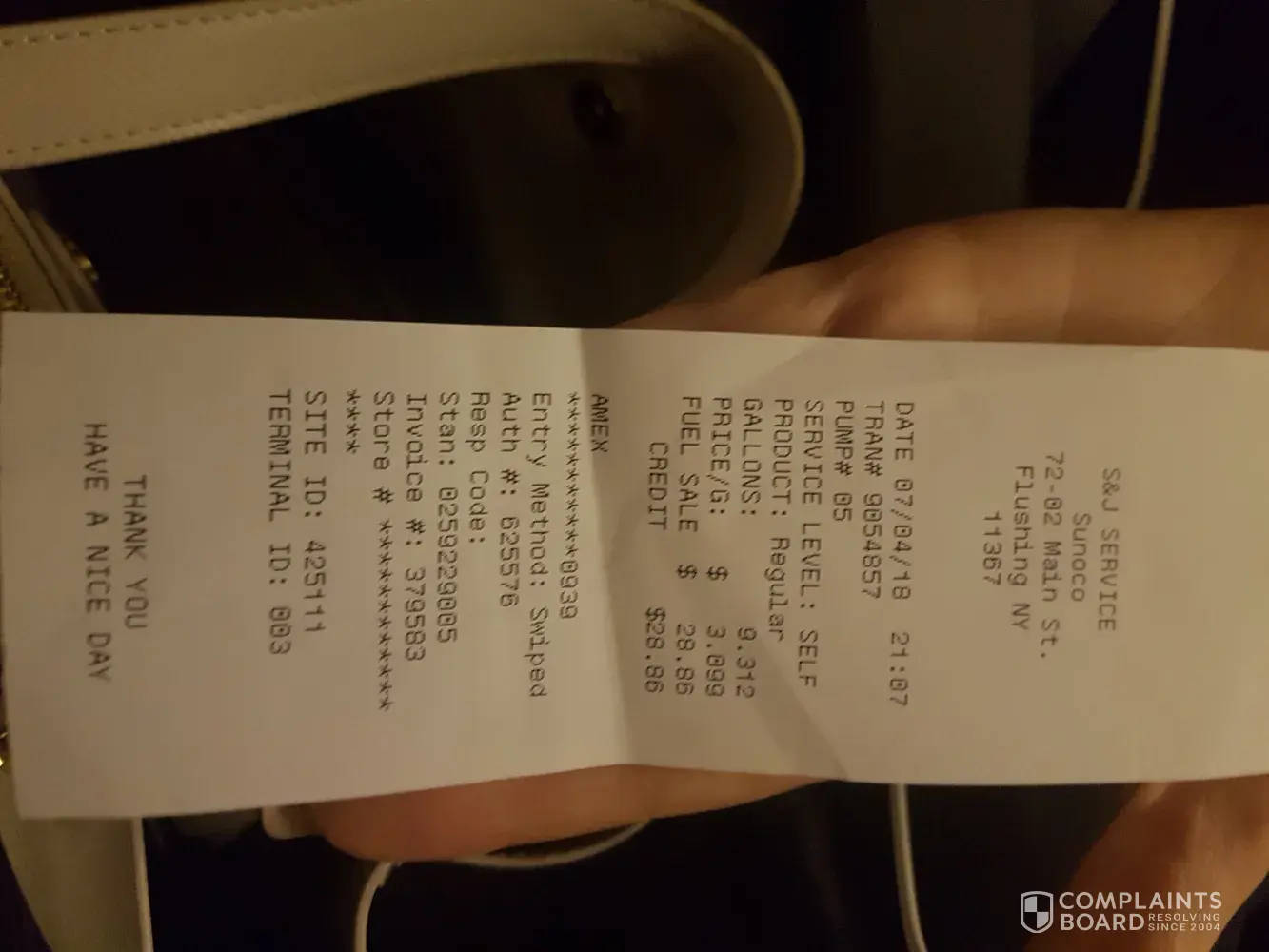 Hello, today on july 4th, at sunoco gas station, s&j service, 72- 02main street, flushing ny 11367, I purchased gasoline for $28.86 and received the check for $28.86. (the recipt 379583, stan: [protected], site id 425111, terminal id 003)