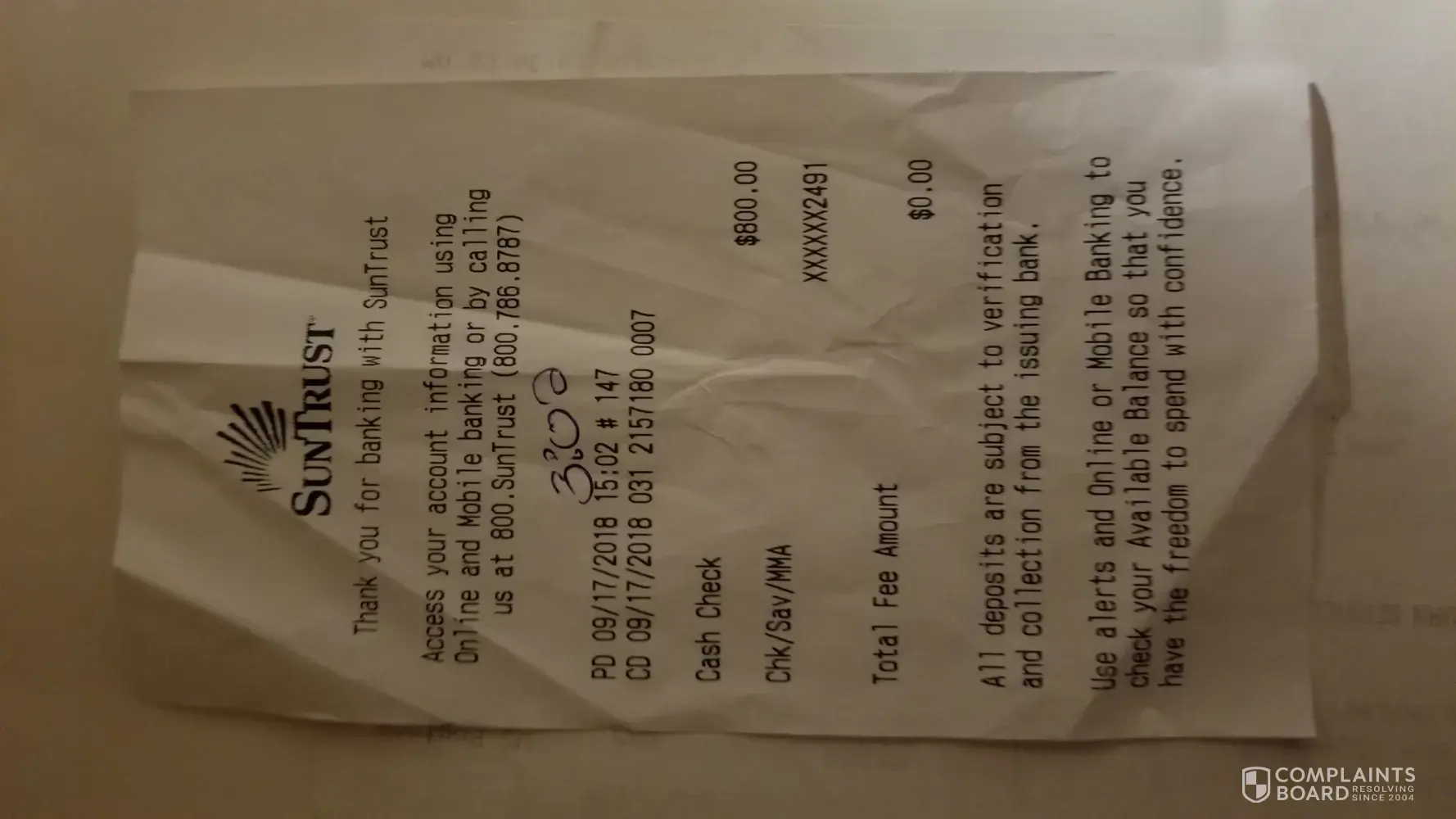SunTrust Banks none delivery of check and lack of service to resolve.