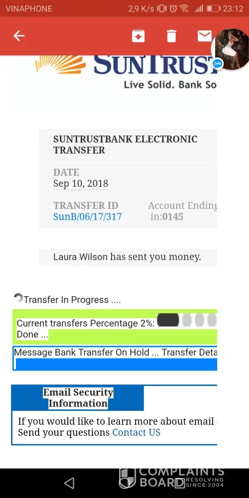 Now we get an email from suntrust, copied below, which claims that you (the payee) has reported an endorsement on the check is fraudulent. Have you contacted the suntrust? I don't think you have.