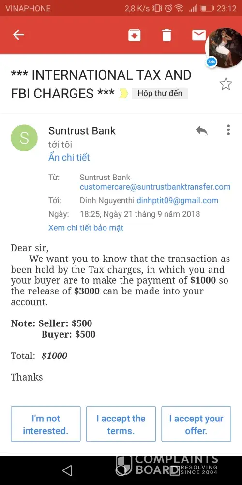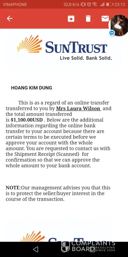 We have previously suffered before because of the suntrust's incompetence on an unrelated matter. All today's correspondence is copied below and all will be forwarded to the suntrust's complaint department after I hear from you, in case you have any additional comments.