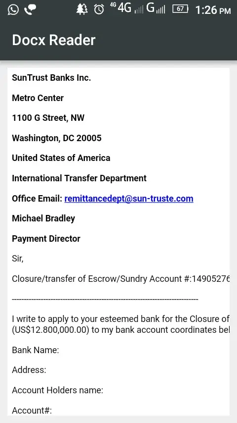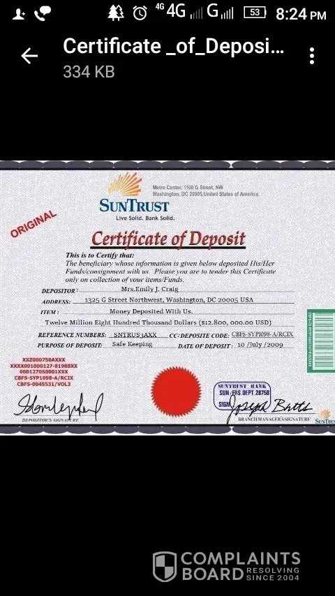 I received emails from your branch Metro centre, 1100 G street, NW Washington DC, 2005 International Transfer Department Tell. +1_206_866_7181 E mail, [protected]@suntruste.com Micheal Bradley Payment Director Sun Trust Mailing that a Fund of Mr's Emily J Craig is transfer to your account. They send copy of certificates now they demands for money to...