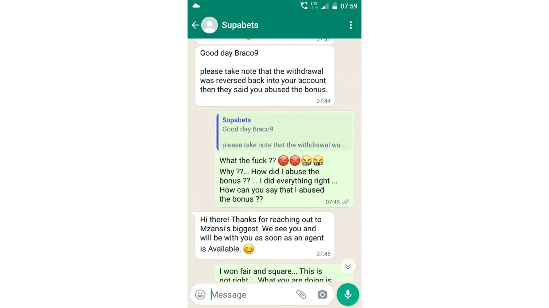 I have been scammed by Supabets betting, I withdrew an amount of R300 from my account which I won fair and reasonable... And now when I am supposed to get my money I am told that I abused the deposit bonus that Supabets gives out to it's new clients I deposited my hard earned into the account and received a deposit bonus... And then won from my deposit. And now when I'm supposed to receive my money/payment they come up with stories and absurd reasons not to pay. I am upset and very heart broken with Supabets... What they did to me is wrong and unfair.