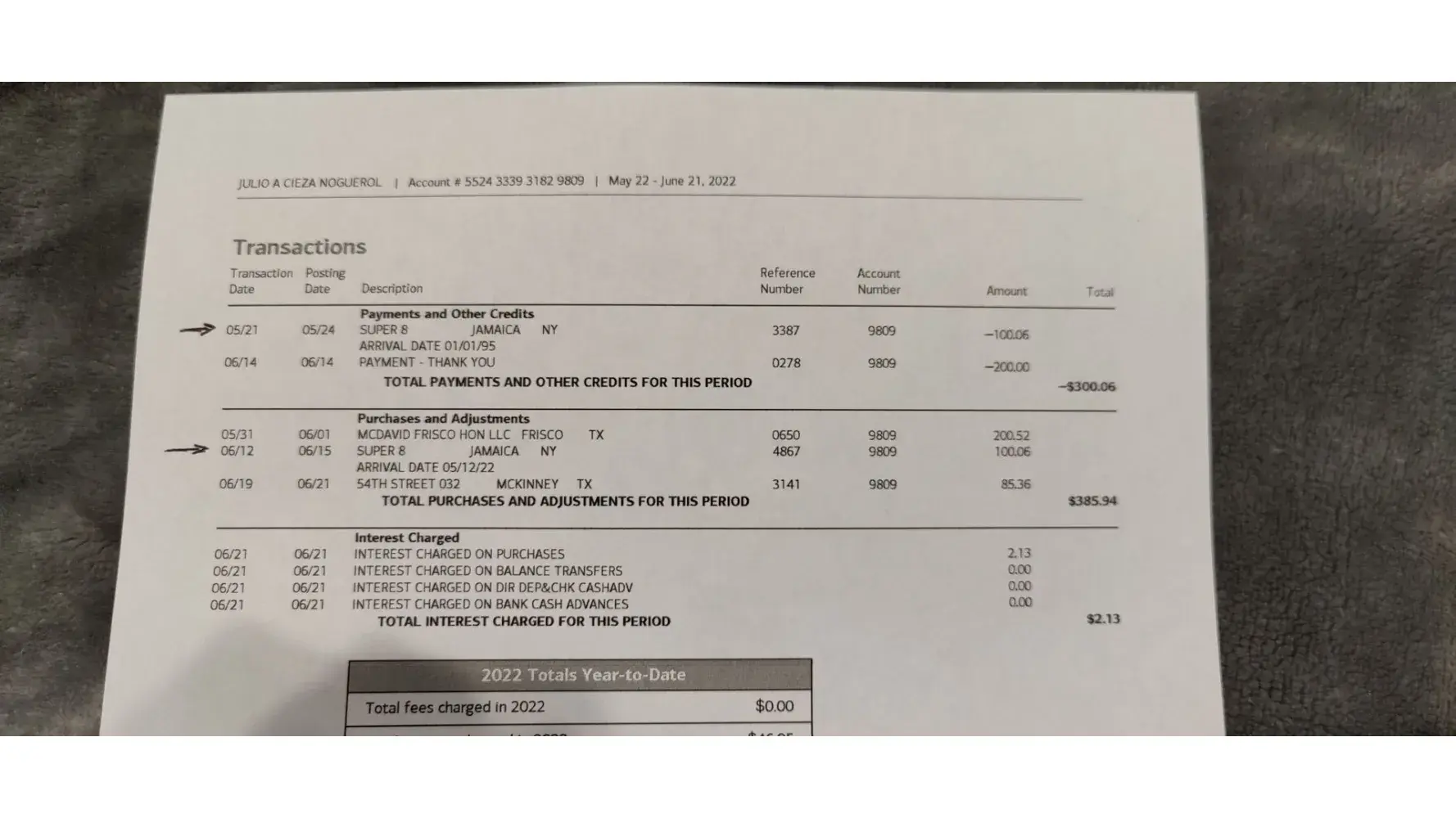 Charges on credit card