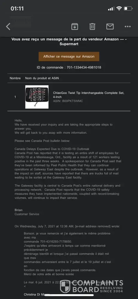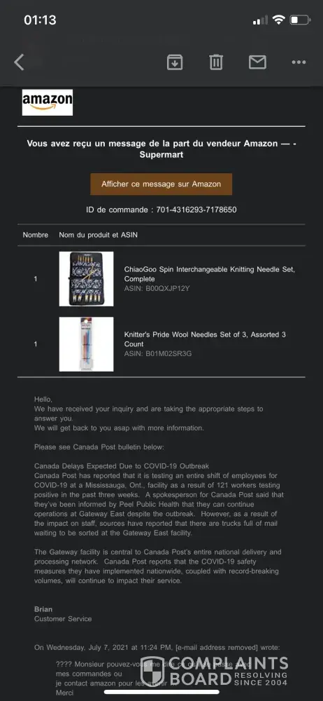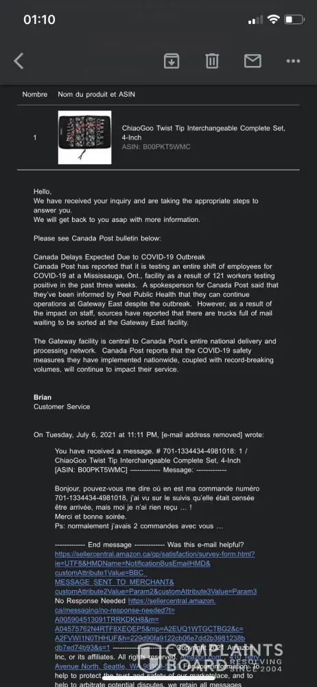 J'ai tenté de contacter votre service à la clientèle via Amazon et je tombe sur un monsieur "Brian" qui ne fait que m'envoyer les mêmes messages de confirmation "réception de votre demande" en boucle et ne m'aide pas, j'ai l'impression qu'il se moque de moi.
